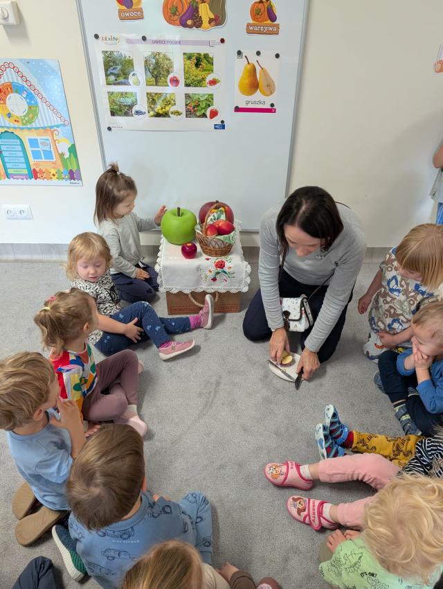 Poznawanie: kształt jabłka, smak, kolor, budowa: pestka, skórka, ogonek. Degustacja jabłek, wartości odżywcze owoców. Więcej zdjęć z zakładce Galeria :Zajęcia dydaktyczne "JABŁKA"- Biedronki cz.II