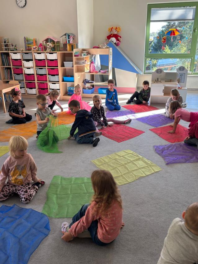 Jesienna zabawa z chustami. Dobieranie kolorami, przeliczanie, składanie chust w figurę geometryczną- trójkąt. Wszystko w takt muzyki B.Strauss. Więcej zdjęć w zakładce Galeria : Jesienna zabawa z chustami - Zające cz.II